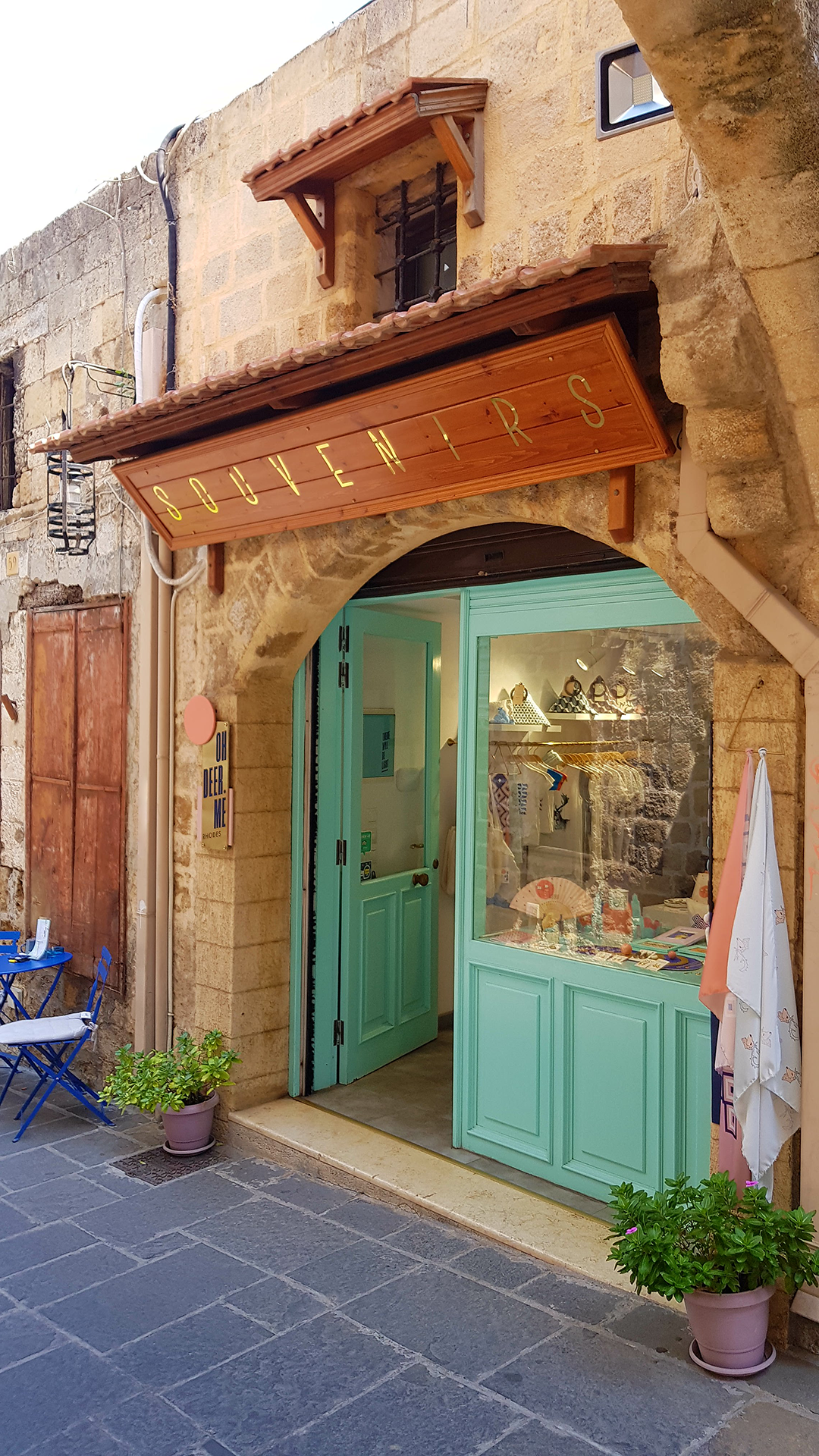 The facade and main display, were painted teal, in order to differentiate the shop, but also to respect the homogenous architecture of Rhodes old town.