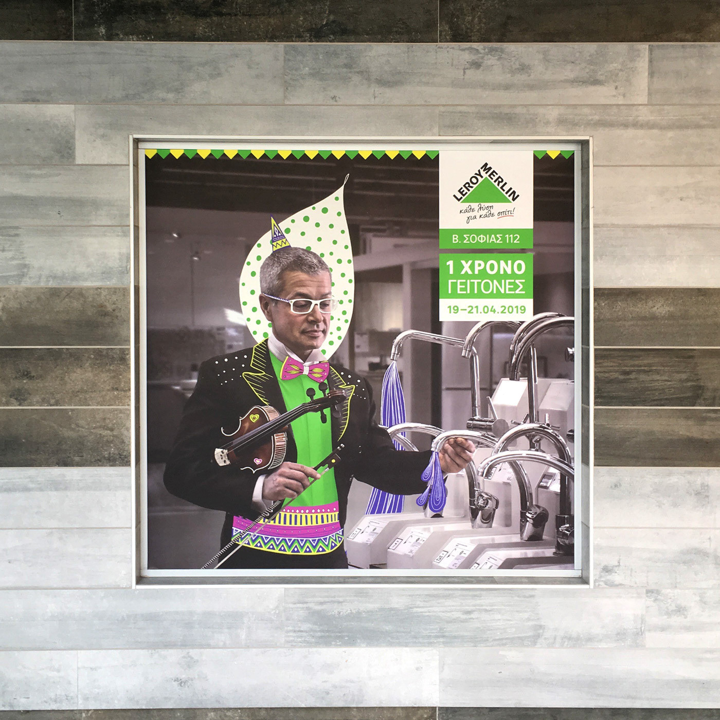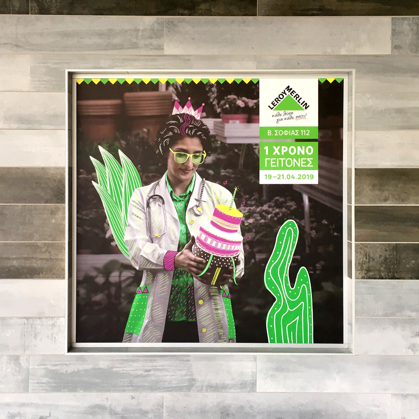 For the campaign of the first year opening of the Leroy Merlin store in Athens center, the Comeback design studio, asked for the design of four festive doodle-like illustrations to be placed upon the store release campaign photographs of the previous year. The illustrations were used in promotional material, for the one year birthday event of the store.